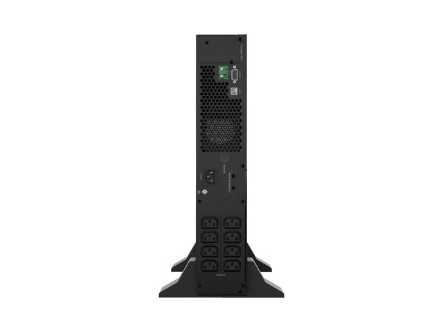 Czarny, metalowy zasilacz UPS do montażu w szafie, wyposażony w wyświetlacz LCD, 8 gniazd IEC C13 i bezpyłową konstrukcję.